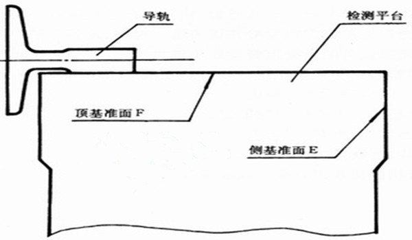 a. 坐标测量法:该测量法用于导轨型式检验。如图一所示,将导轨的导向面自由状态贴靠在检测平台上,用检测平台上平面F为基准测导向面距顶、底两端各5mm处;用检测平台侧面E为基准测顶面中间处,以上均沿导轨长度方向测量,要求相邻测点不大于100mm,宜连续测量。在坐标纸上横坐标为导轨长度位置值,纵坐标为测值,对导向面顶、底各测点分别连接曲线,按导轨直线度要求分别在顶、底两条曲线上选取最大的(B/A)值,其中计算(B/A)值的基准线为四线凸凹极值点的贴切线,且两个极值点距离必须大于1m。同时,截取在同一横坐标上,顶、底两条曲线间上偏差与下偏差的相对差值除以这两处的间距(单位为米)后的最大值,即为每米相对扭曲值e,再折算为扭曲度γ,其值按下式计算: